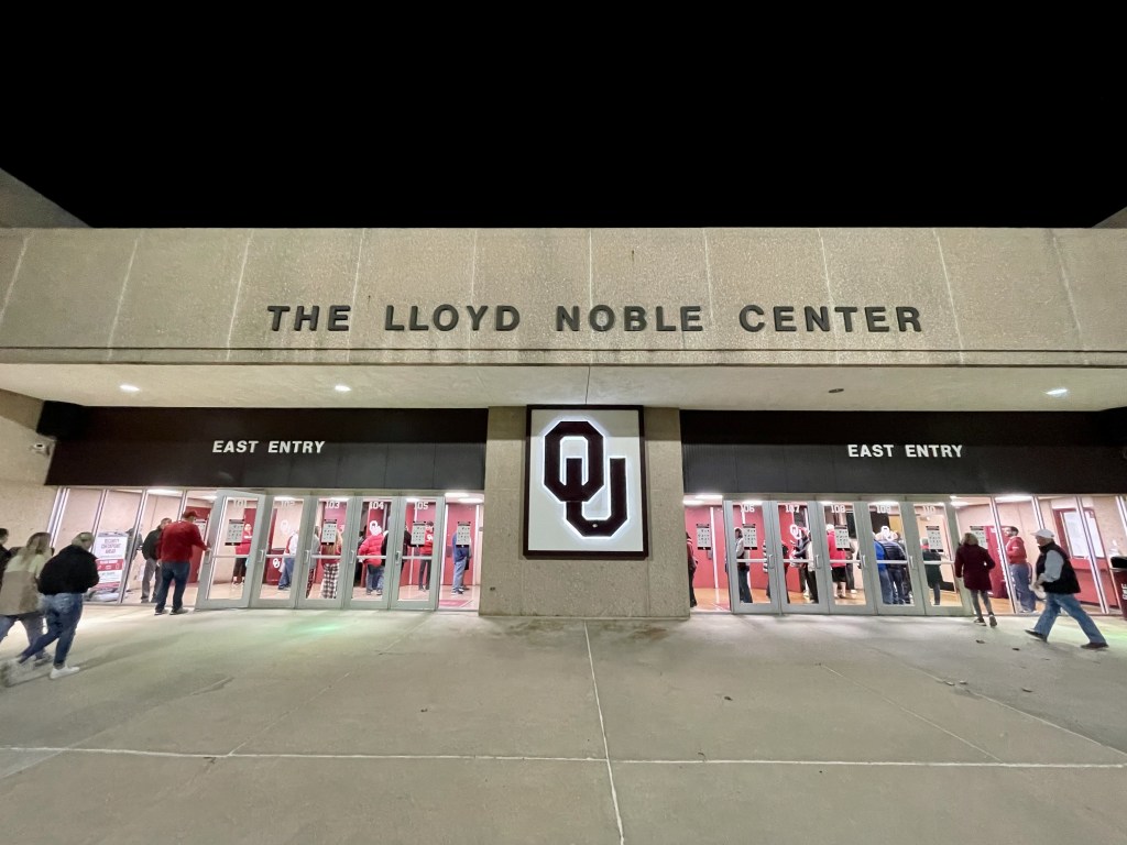 The Lloyd Noble Center is a good bit south of the heart of campus, so I parked in one of the plentiful parking spaces conveniently located directly adjacent to the arena. The drab concrete slab of a building is almost 50 years old, having broken ground in 1973. Entry was quick and painless, partly due to a scant crowd.