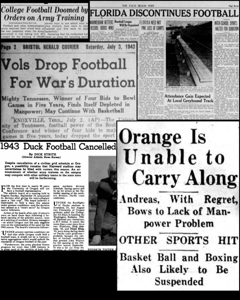 In 1943, many college football programs faced rosters so depleted by the war effort that they were forced to cancel their season. Several rivalries that had been played annually for decades were suddenly suspended, while new military service teams sprung up as college athletes trained for war.